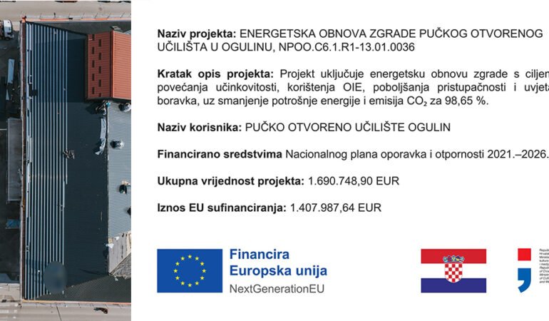 Sredstva za provedbu projekta osigurana su iz EU sredstava putem Ugovora o dodjeli bespovratnih sredstava između Pučkog otvorenog učilišta Ogulin i Ministarstva kulture i medija Republike Hrvatske u iznosu od 1.407.987,64 EUR, dok preostali dio sufinancira Grad Ogulin. Projekt uključuje izradu projektne dokumentacije, energetske preglede, provedbu mjera energetske učinkovitosti i korištenje obnovljivih izvora energije, zamjenu stolarije, toplinsku izolaciju, modernizaciju sustava grijanja, ugradnju fotonaponskih modula, sustava upravljanja zgradom i energetski učinkovite rasvjete. Predviđene su i mjere pristupačnosti osobama s invaliditetom, uređenje zelenih površina, parkirališta za bicikle i punionice za električna vozila. Radove izvodi MONTEL d.o.o., a projektnu prijavu izradili su Pučko otvoreno učilište Ogulin, Grad Ogulin i Razvojna agencija Karlovačke županije KARLA. Zbog provedbe navedenog projekta prostori Učilišta privremeno nisu dostupni za korištenje. Zahvaljujemo na razumijevanju tijekom trajanja radova. Financira Europska unija – NextGenerationEU. Izneseni stavovi i mišljenja samo su autorova i ne odražavaju nužno službena stajališta Europske unije ili Europske komisije. Ni Europska unija ni Europska komisija ne mogu se smatrati odgovornima za njih.