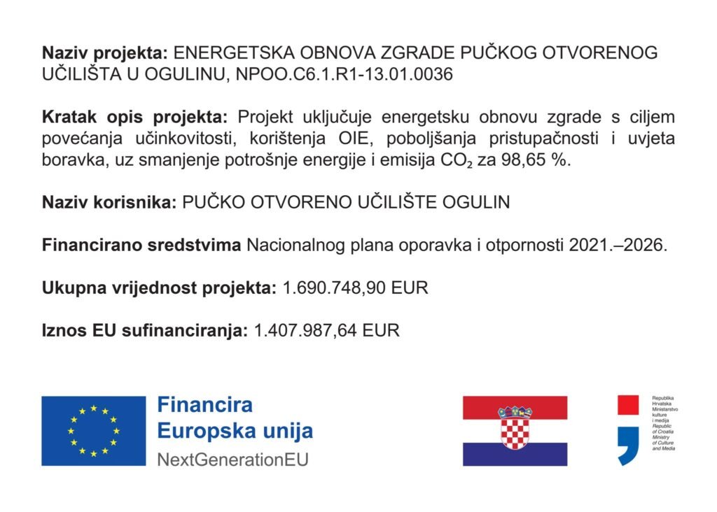 Sredstva za provedbu projekta osigurana su iz EU sredstava putem Ugovora o dodjeli bespovratnih sredstava između Pučkog otvorenog učilišta Ogulin i Ministarstva kulture i medija Republike Hrvatske u iznosu od 1.407.987,64 EUR, dok preostali dio sufinancira Grad Ogulin. Projekt uključuje izradu projektne dokumentacije, energetske preglede, provedbu mjera energetske učinkovitosti i korištenje obnovljivih izvora energije, zamjenu stolarije, toplinsku izolaciju, modernizaciju sustava grijanja, ugradnju fotonaponskih modula, sustava upravljanja zgradom i energetski učinkovite rasvjete. Predviđene su i mjere pristupačnosti osobama s invaliditetom, uređenje zelenih površina, parkirališta za bicikle i punionice za električna vozila. Radove izvodi MONTEL d.o.o., a projektnu prijavu izradili su Pučko otvoreno učilište Ogulin, Grad Ogulin i Razvojna agencija Karlovačke županije KARLA. Zbog provedbe navedenog projekta prostori Učilišta privremeno nisu dostupni za korištenje. Zahvaljujemo na razumijevanju tijekom trajanja radova. Financira Europska unija – NextGenerationEU. Izneseni stavovi i mišljenja samo su autorova i ne odražavaju nužno službena stajališta Europske unije ili Europske komisije. Ni Europska unija ni Europska komisija ne mogu se smatrati odgovornima za njih.